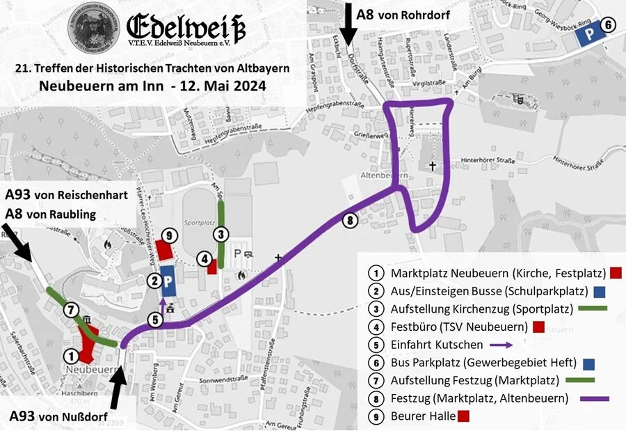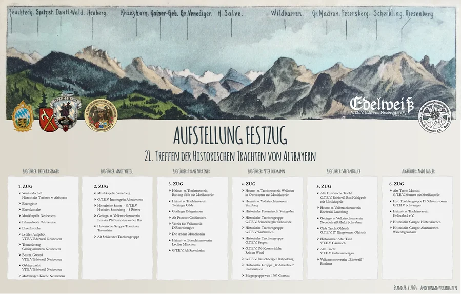 In dem Ort der bereits König Maximilian I. zu dem Ausspruch „Das ist die schönste Aussicht im bayrischen Gebirg!“ inspirierte finden sich am 12. Mai 2024 die Trachtlerinnen und Trachtler der Vereinigung der Historischen Trachten von Altbayern zusammen. Umrahmt von historischen Gebäuden bildet unser Marktplatz in Neubeuern den perfekten Rahmen für das 21. Treffen der Historischen Trachten von Altbayern. Es ist mir eine große Ehre in meiner Funktion als erster Vorstand des Trachtenvereines „Edelweiß“ Neubeuern und somit als Veranstalter dieses Treffen, sowie als erster Vorsitzender der Historischen Trachten von Altbayern unsere Gäste begrüßen zu dürfen. Es erfüllt mich bei jedem Trachtentreffen mit großer Freude zu sehen, welche Vielfalt die historischen Gewänder unserer Vorfahren zeigen und ich kann mir gut vorstellen, dass man damals die Herkunft einer Person an ihrer Kleidung erkennen konnte. Meine Bitte an alle Trachtlerinnen und Trachtler ist, dass wir gemeinsam alles tun um unsere Bräuche, unsere überlieferten Gewänder und alles, was Bayern so liebenswert macht erhalten und an die nächste Generation weitergeben. Laßt uns zusammen feiern, unvergessliche Momente erleben und unser Motto vom Gaufest 2017 „z‘Neibeian do feian mia“ wieder aufleben lassen.